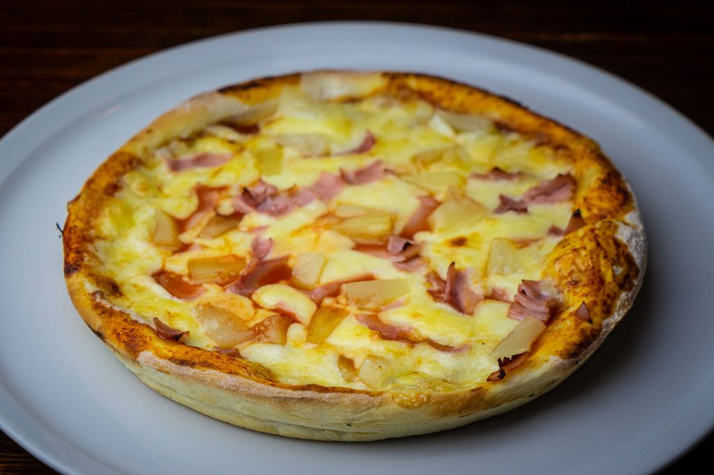 Salsa de tomate, salame, queso, jamón, morrón, aceitunas.