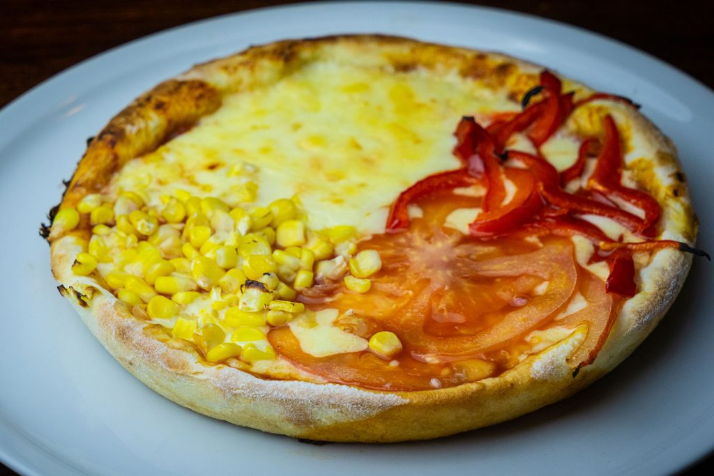 Salsa de tomate, queso, choclo, aceitunas, morrón
